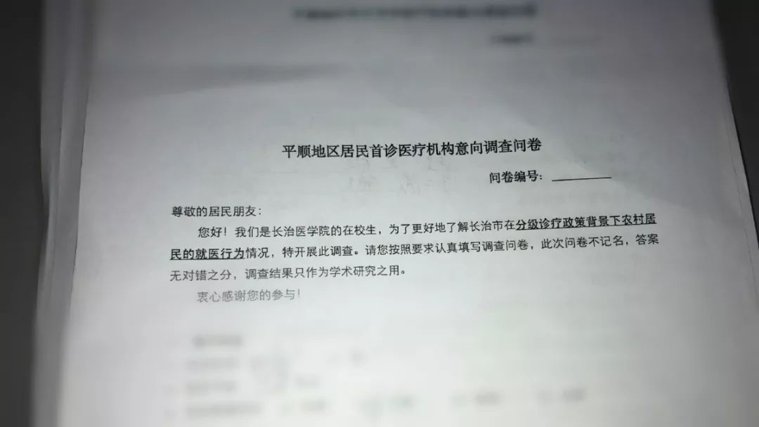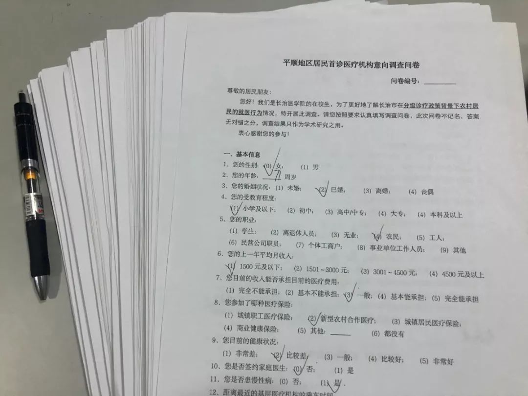 问卷内容主要是为了更好地了解分级诊疗政策背景下长治市平顺地区农村居民的就医意愿和就医行为,本次调研旨在明确龙溪镇居民的首诊医疗机构意向。问卷内容包括基本信息、就医意愿与就医行为以及政策认知三个维度。