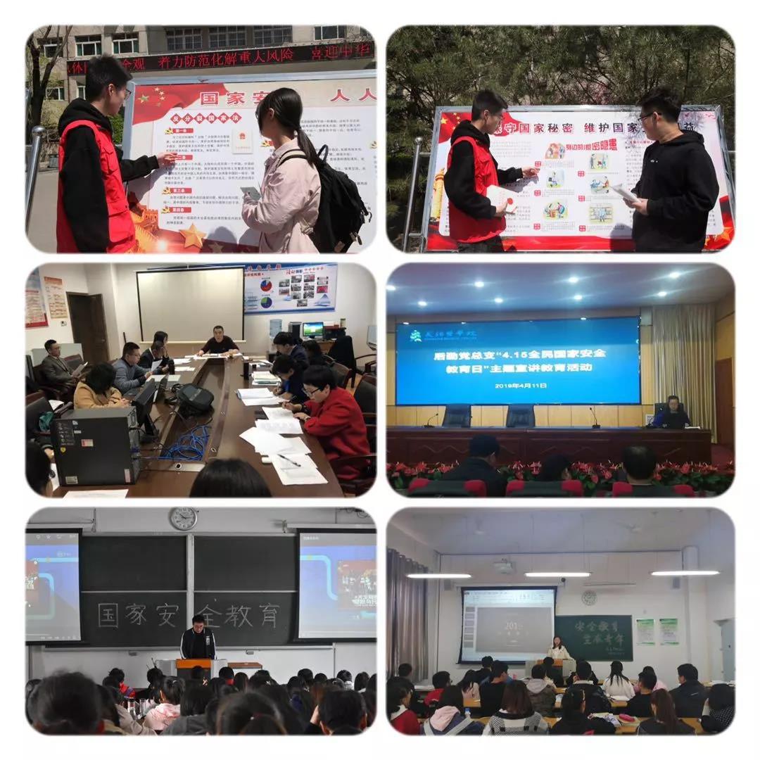 2019年4月15日是《国家安全法》颁布实施第四个“全民国家安全教育日”。为了更好地贯彻习近平总书记全面依法治国新理念新思想新战略,提高公民国家安全意识,我校组织开展了以“坚持总体国家安全观,着力防范化解重大风险,喜迎中华人民共和国成立70周年”为主题的系列宣传活动。学校精心制作了《国家安全法》《反恐怖主义法》《反间谍法》等多块宣传展板,并在大屏幕播出保密宣传教育片,吸引大批学生驻足观看。各院系通过主题班会、知识竞答、主题讲座、观看安全教育影片等多种形式进行国家安全教育。