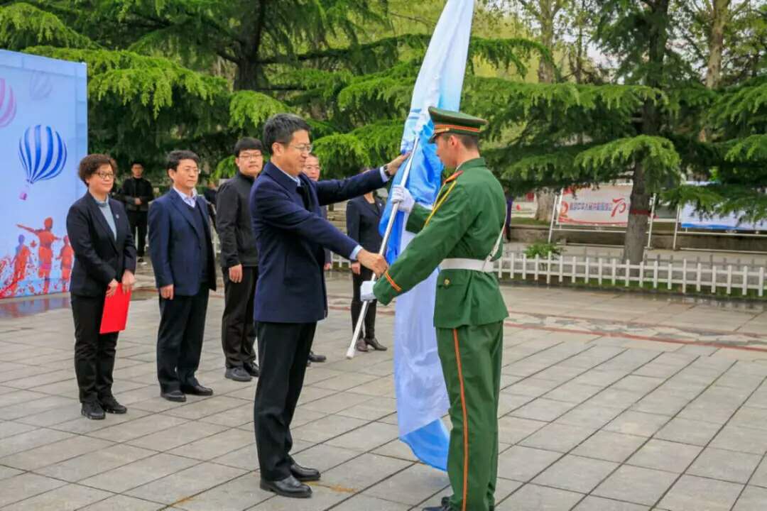 李华荣向二青会志愿服务队代表授旗。本次二青会,我校将有200名志愿者参与志愿服务工作。