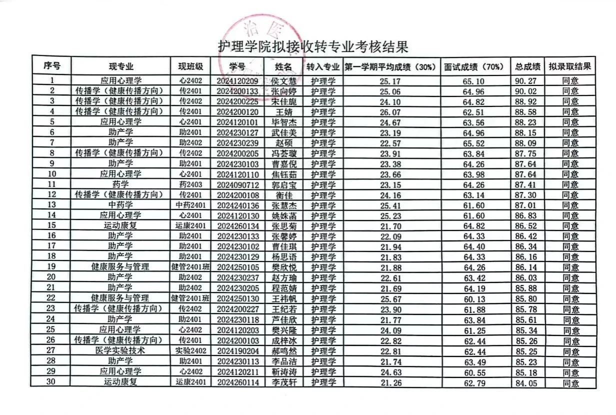 根据《365英国上市本科学生转专业管理规定》(长医教字(2021)39号)有关规定,由学生本人提出申请,经学生所在院系部资格审查、英国365公司考核通过,同意侯文慧等三十名学生转入护理学专业。现对拟转入学生成绩进行公示。
