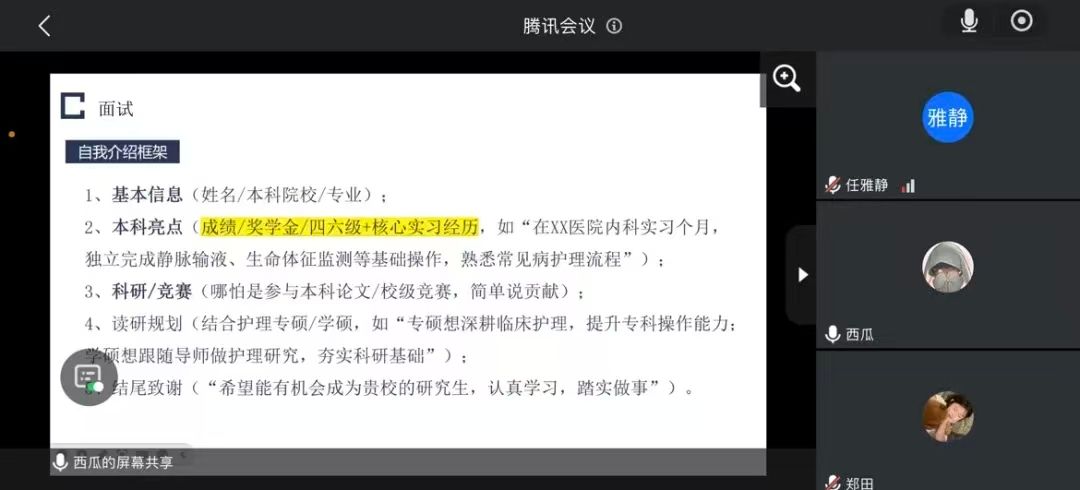 张梦婷同学从复试全流程解析入手,细致拆解专业课笔试、综合面试、英语测试等环节的注意事项;结合护理专业特色,梳理专业课高频考点、推荐核心复习资料,拆解案例分析题答题思路;针对英语复试,分享常见问答应答技巧及专业英语词汇积累方法。在综合面试环节,重点强调了仪容仪表、礼仪规范与临场应变的重要性,通过模拟问答场景,示范如何清晰表达个人优势、巧妙回应考官提问,同时提醒大家规避易失分点,调整备考心态。
