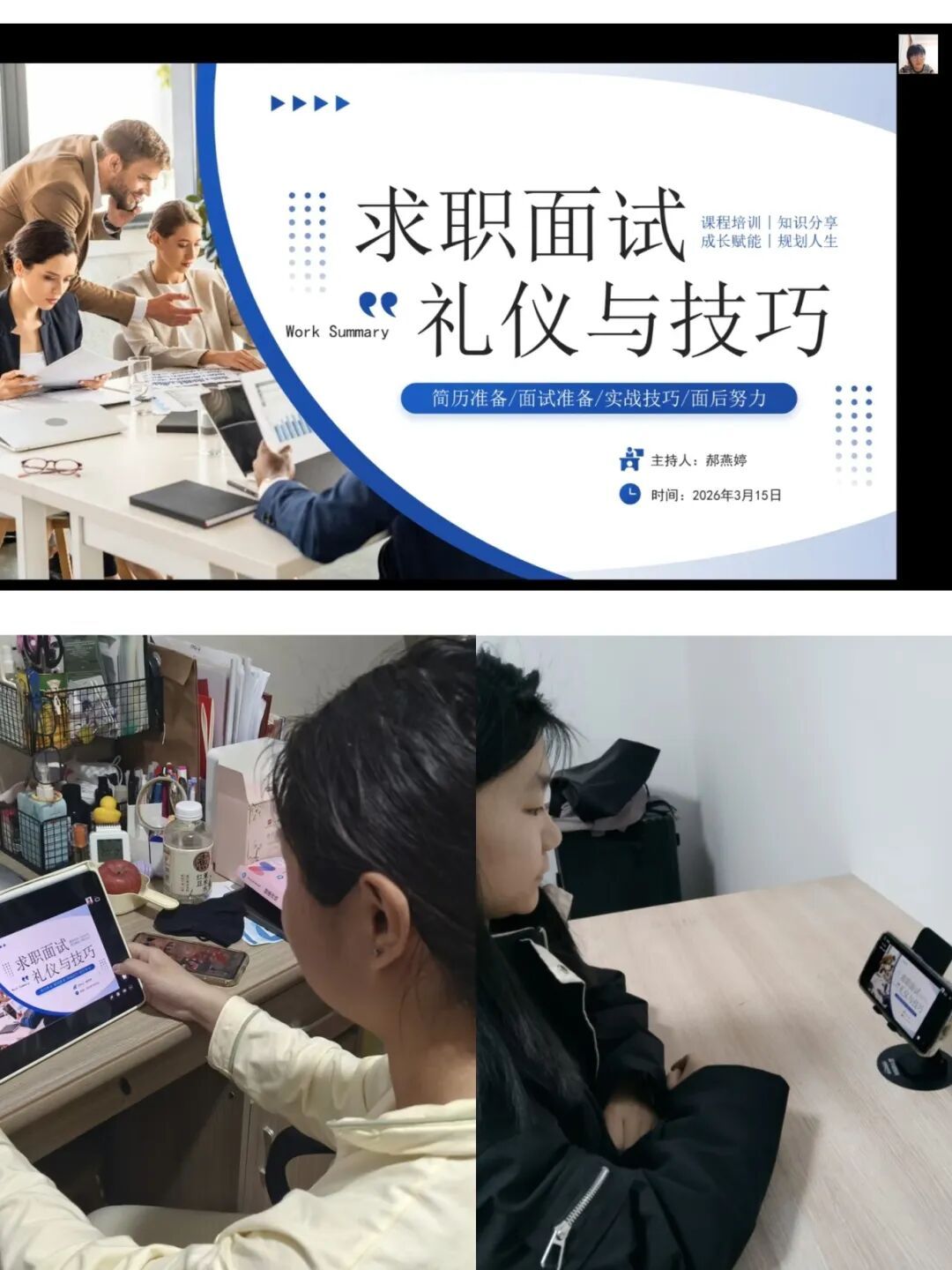 培训中,辅导员深入剖析当前就业市场的招聘趋势与单位用人标准,以简历精修,打磨实习经历、专业技能等为核心亮点,同步开展模拟面试、求职礼仪指导,解决学生简历同质化、面试发挥不稳等痛点,指导同学们用数据和成果量化自己的实习经历与经验。面试环节,老师从面试前的心理调适,到面试中的沟通技巧,再到面试后的复盘跟进,进行了全方位的拆解与指导。