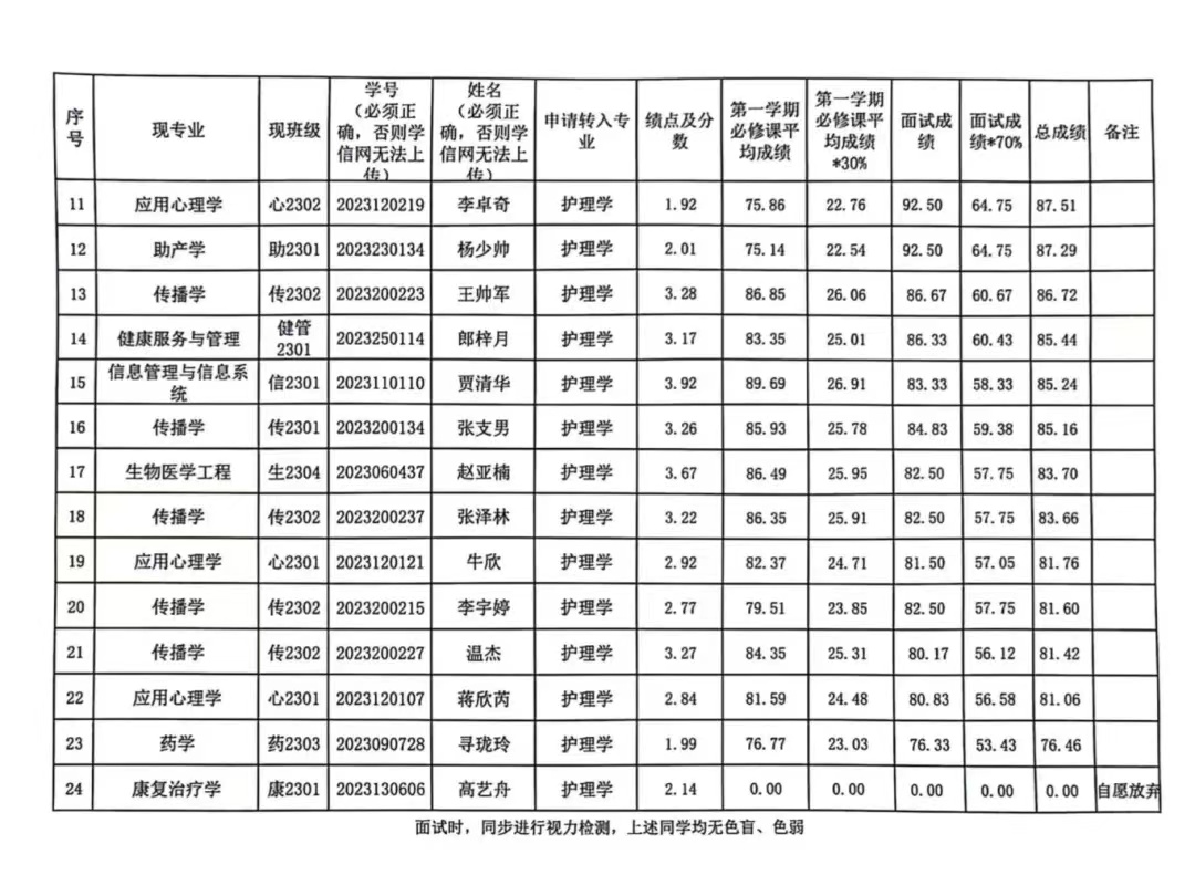 拟转入护理学专业学生成绩