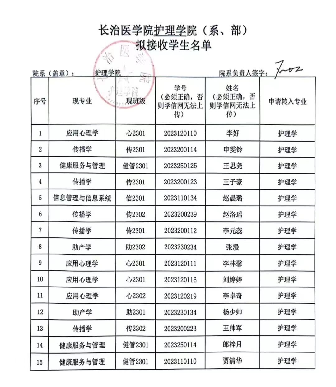 关于拟接收李好等十五名学生转专业的公示