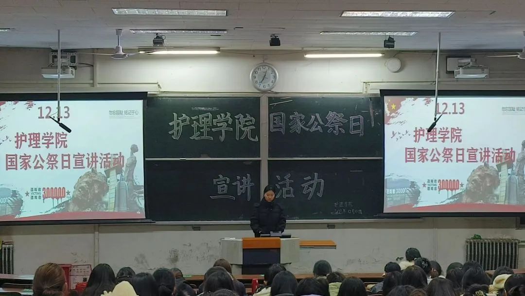 硝烟虽已远去,国耻民殇不应忘记。宣讲开始前,全体人员为南京大屠杀受害者默哀一分钟,缅怀遇难同胞。宣讲开始后,助产2202团支书王煜煊为大家讲解国家公祭日设立的原因,通过南京大屠杀珍贵影像资料帮助大家了解那一段悲惨的历史,向我们揭露了侵华日军的罪恶行径。通过微视频《每个人的12.13》向大家讲述了南京大屠杀受害者、经历者、“南京大屠受害者杀守墓人”等人自述那段不愿提及的过往。视频结束后,大家纷纷表达了对遇难同胞的深切同情和对日本侵略者的强烈愤慨,同时深切感悟到要珍惜和平,努力学习,为祖国的繁荣富强贡献自己的力量。至此,宣讲活动结束。