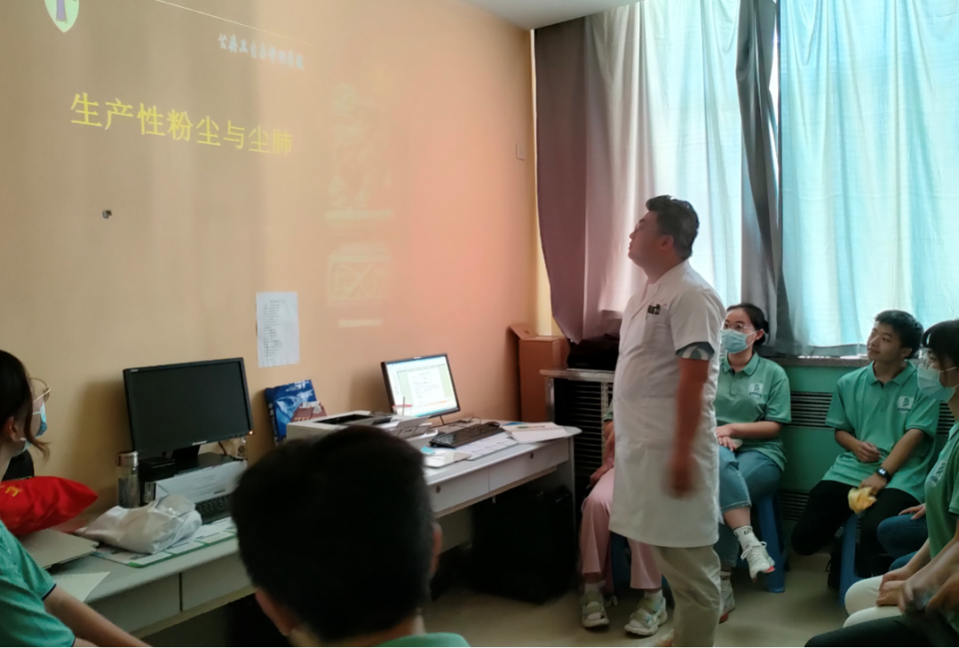 下午3:30,内科杨医生为志愿者们讲解了常见职业病,包括粉尘的来源、分类、理化性质、粉尘所致的疾病、发病机制、患病后的注意内容以及治疗方法。随后,杨医生带领同学们去看望了一位病人,该病人为尘肺患者,杨医生带领我们学习观察了该病人的胸片,并且为我们讲解了如何去正确地看胸片。最后,由苏伟同学给病人科普了尘肺的预防,以及患病后需要注意的事项。