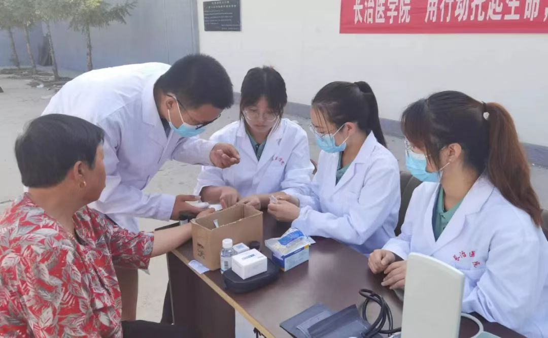 到达常金村广场之后,便看到了已经在此等候的村民,大家立即开始准备,投入工作。登记信息,套血压袋,测量血糖……一套专业流畅的操作充分彰显了我们长医护理学子的风采,得到了当地村民的一致赞赏。