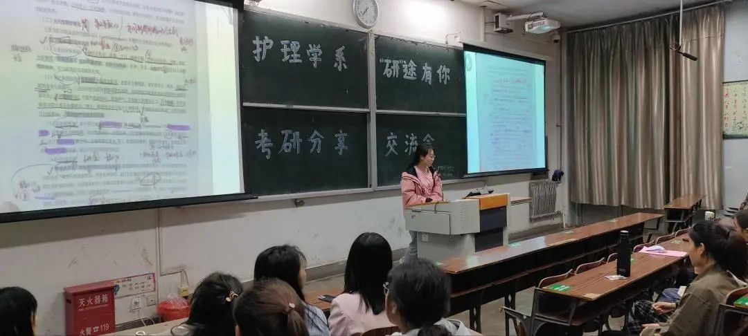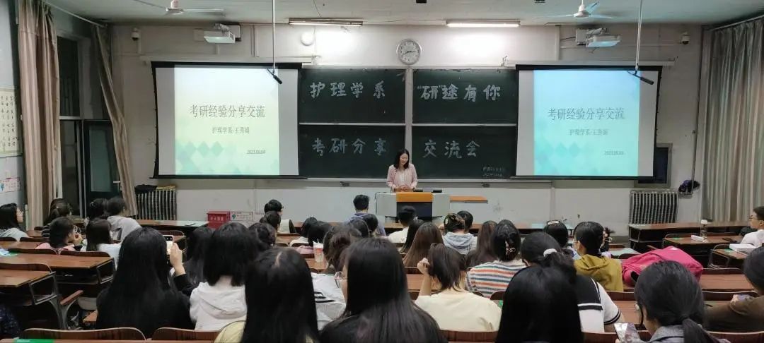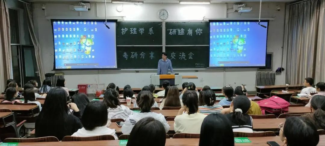 分享会上,2019级考取研究生的同学从自身经历出发,先后围绕院校选择、报名流程、备考经验等问题进行详细介绍,并就如何高效制定考研学习计划、平衡专业课与公共课复习时间等问题给出了各自的意见;接下来护理学系教师王秀娟和韩婷婷就读研与就业这两个同学们关注的问题与大家进行了交流;系党总支书记石虹,系团委书记谢冰分别在两个教室进行总结,表达了对同学们的美好祝愿,并叮嘱同学们要多和优秀的学长学姐交流,在接下来的时间里坚定信心、努力备考,相信量的积累必将达成质的飞跃!