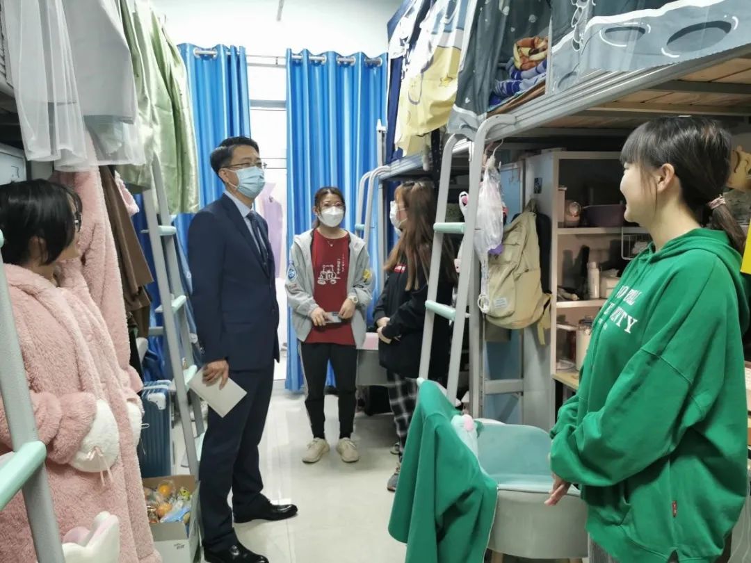 在润德楼,李华荣就学生思想、学习、生活等情况与同学们进行了亲切交流,叮嘱同学们要养成良好的生活、学习习惯,鼓励同学们加强体育锻炼,营造整洁高雅、健康文明、勤奋向上的寝室环境。