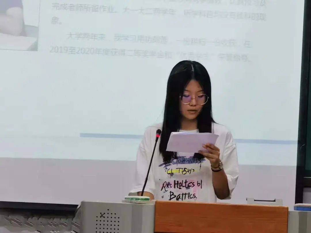 首先,主持人宣读评分细则。接着,由护理学系党总支书记石虹发言,书记指出,希望各位评审团成员能够公平公正的打分,也期待每一位候选人的出色表现。接着,主持人宣布评选会正式开始。七位候选人通过精美的PPT以及绘声绘色的演讲,从学习情况、所获荣誉、思想政治、素质拓展、社会实践、体育活动等多个角度展示了我系优秀学生的个人风采,台下掌声不断。通过各评审的综合打分,最终选出了三位候选人参加校级国家奖学金评选,他们分别是武静(护理1905班)、刘甜(助产1901班)、吴高轩(护理1802班)。党总支副书记张晓霞老师给出寄语:青春是用来奋斗的,希望同学们在未来的道路上越走越远,越走越顺畅。最后,主持人宣布护理学系2020-2021学年国家奖学金评选会圆满结束。
