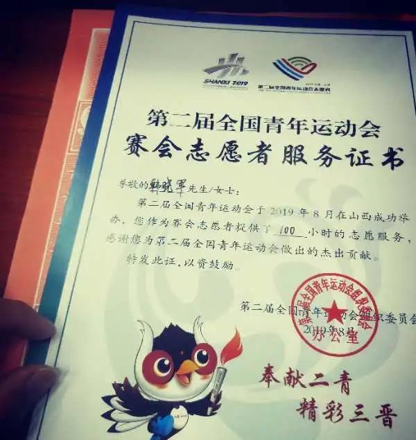2019年“第二届全国青年运动会”优秀志愿者及赛会服务证书