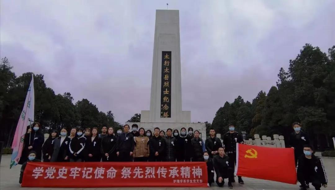 传承革命精神,凝聚奋进力量。为推动党史学习教育走深走实,切实做到学史明理、学史增信、学史崇德、学史力行,引导学生党员厚植爱党、爱国、爱社会主义情感。4月3日上午,护理学系学生党支部赴太行太岳烈士陵园,开展“学党史牢记使命,祭先烈传承精神”主题党日活动。第一学生党支部书记张召弟、宣传委员孙婧及30余名学生党员参加活动。