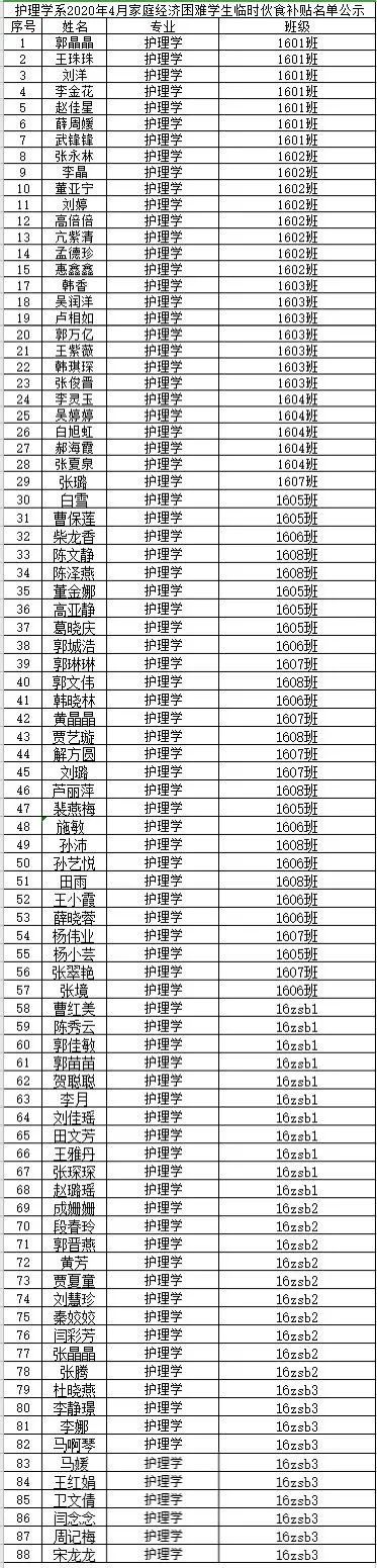 护理学系2020年4月家庭经济困难学生临时伙食补贴名单
