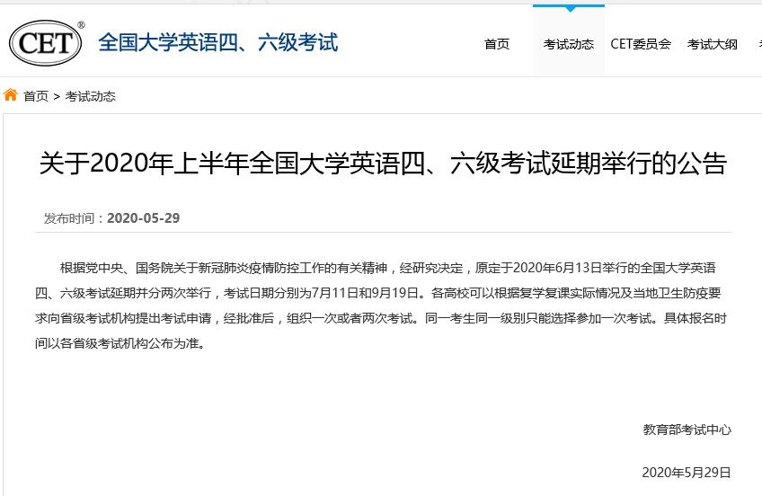 根据党中央、国务院关于新冠肺炎疫情防控工作的有关精神,经研究决定,原定于2020年6月13日举行的全国大学英语四、六级考试延期并分两次举行。