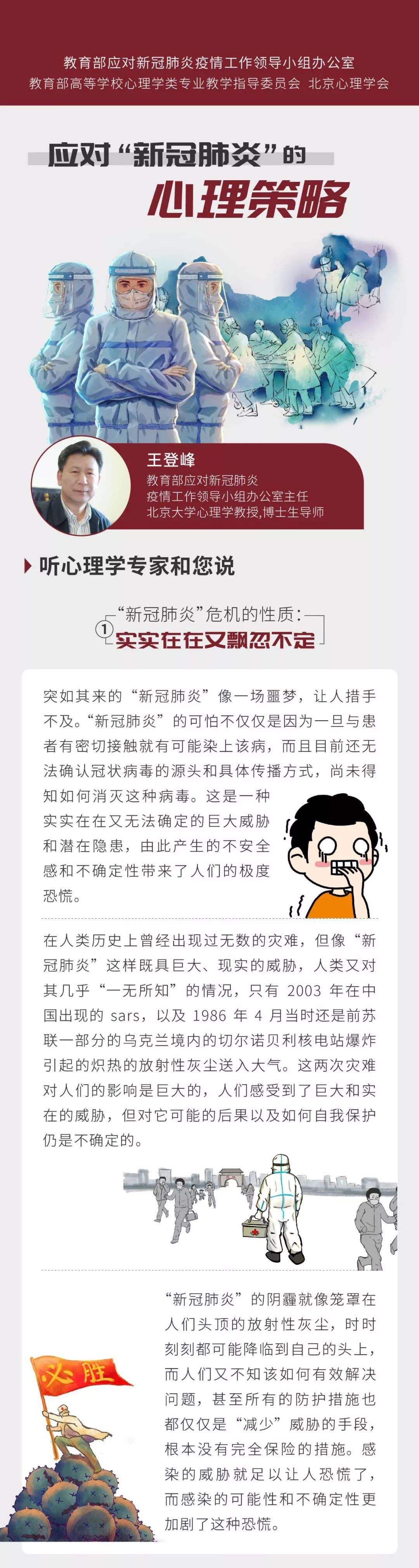 今天,微言教育推出第①期,随教育小微一起来看教育部应对新冠肺炎疫情工作领导小组办公室主任,北京大学心理学教授、博士生导师王登峰给师生们带来的5大心理策略