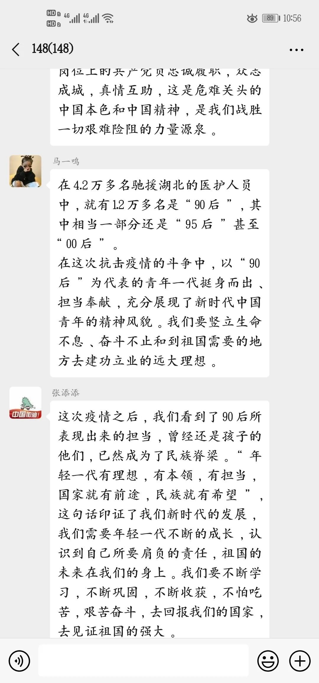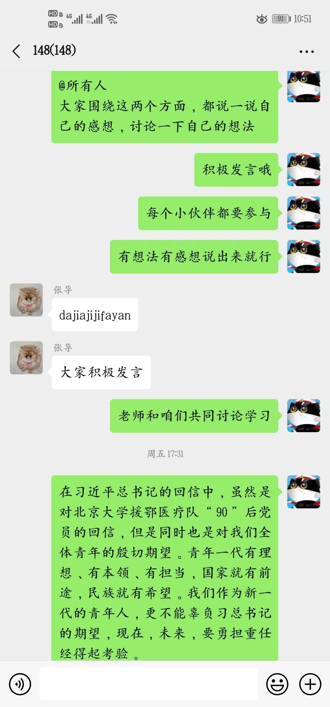 会前,大教班长刘浩组织同学们认真学习习近平总书记给北京大学援鄂医疗队全体“90后”党员的回信精神,通过线上会议的形式,开展讨论。同学们根据习近平总书记在回信中所提现到的担当奉献、挺身而出的精神发表自己的看法和见解,共同探讨习近平总书记在信中所表达的精神理念。认真领会习近平总书记的谆谆嘱托,学习在抗击疫情的斗争中,以“90后”为代表的青年一代所表现出的使命感和责任感,牢记总书记对广大青年的要求,肩负时代赋予我们的使命,用实际行动唱响新时代青春之歌。总书记的深情寄语和殷切嘱托,激励着各条战线上的广大青年人,为打赢疫情防控阻击战继续奋战、再立新功,为党和人民的事业作出新时代青年的贡献。我们能看到年轻的脸庞朝气蓬勃,青春的力量一往无前。让青春在党和人民最需要的地方绽放绚丽之花。