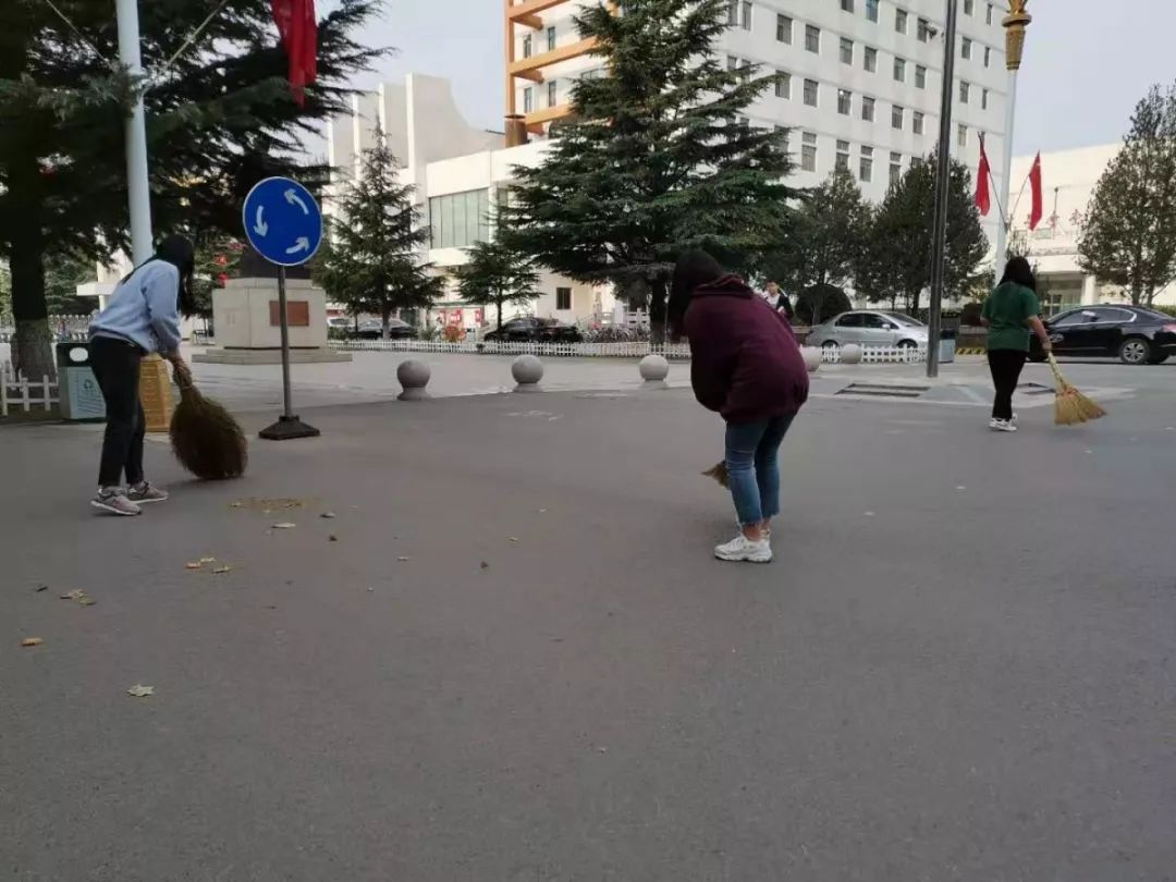 清晨,日光微透,护理学系的学生就开始为庆祝祖国生日做着准备工作。他们拿着清扫工具分工合作,干劲十足,认真细致地清扫着校园各处,把校园以一种崭新的姿态呈现出来。