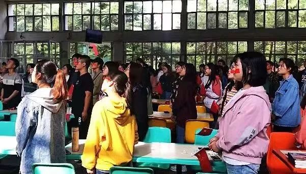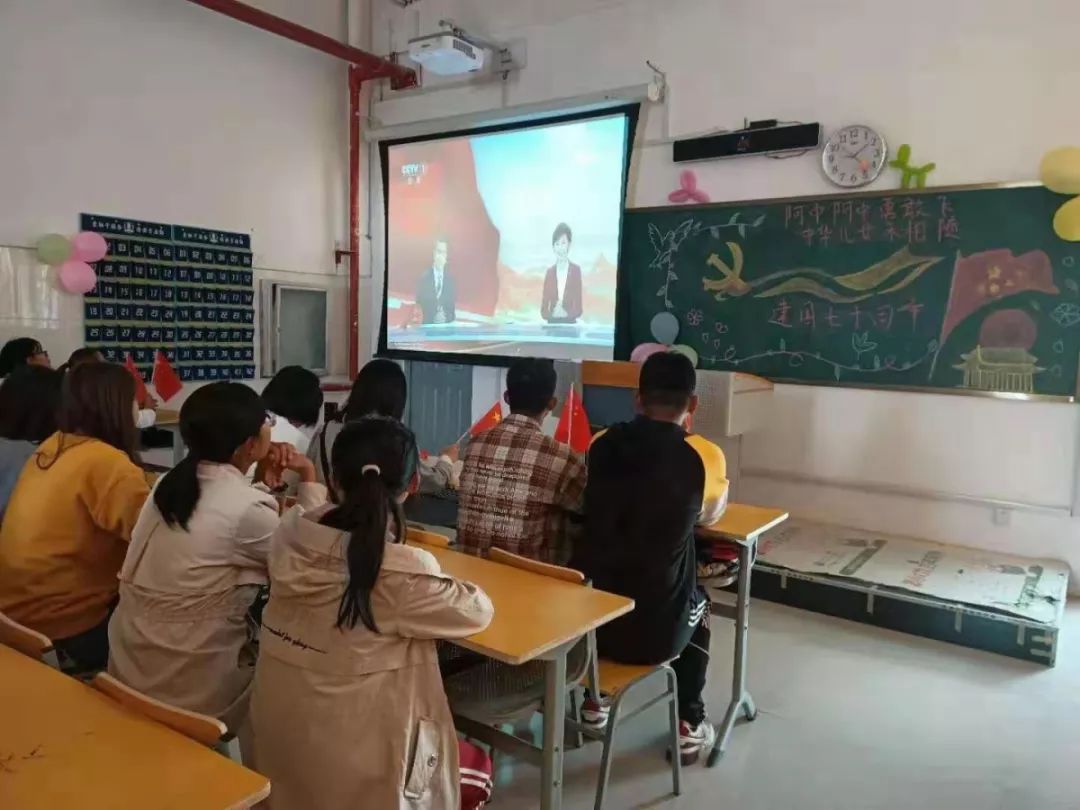 上午9点30分护理学系党总支书记石虹老师亲自组织护理学系大二、大三及专升本国庆假期留校的同学们观看《庆祝中华人民共和国成立70周年大会》实况。同学们一齐祝福祖国母亲70周岁生日快乐,祝愿祖国繁荣昌盛,并摇动手中的小红旗为祖国喝彩。