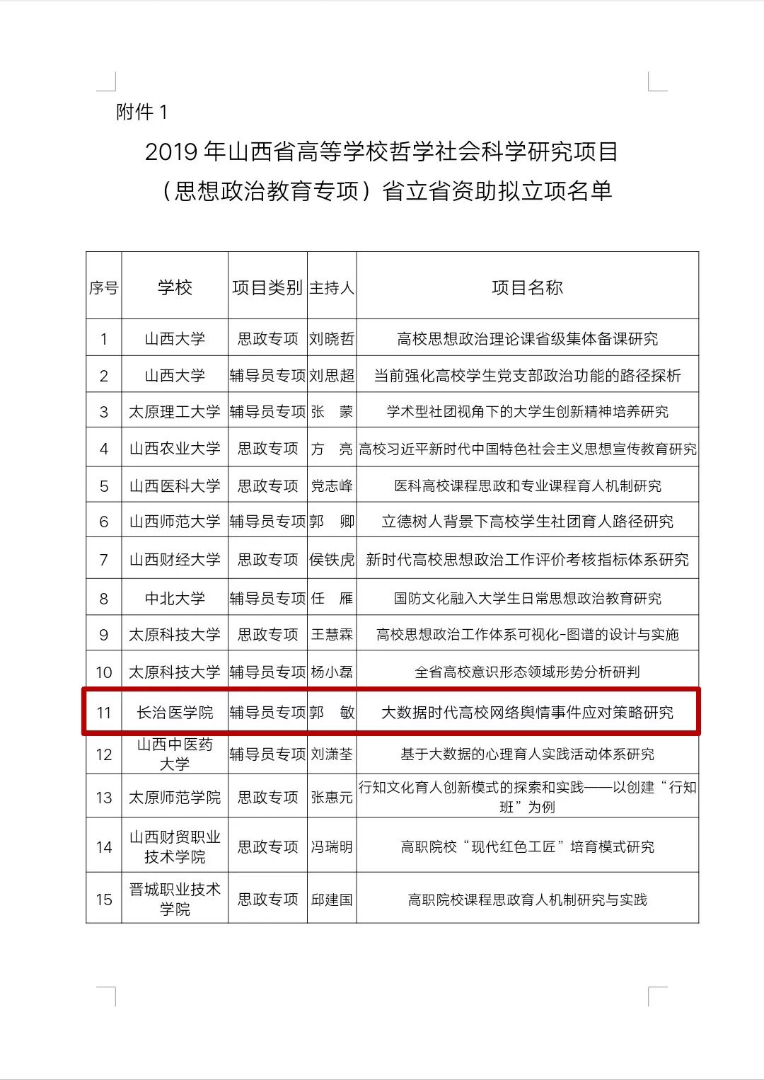 山西省高校哲学社会科学研究项目(思想政治教育专项)分为“省立省资助”“省立校资助”两类,是我省为全面贯彻落实全国高校思想政治工作会议、学校思想政治理论课教师座谈会精神而组织实施的。申报工作开展以来,学校党委学工部高度重视,加强项目申报的宣传动员与组织指导,在全校辅导员的积极参与下圆满完成了此次申报工作。下一步,学工部将加强项目的组织实施和管理监督,进一步鼓励辅导员创新思路、科学研究、积极实践,提升我校思想政治工作研究水平,促进辅导员队伍的专业化、职业化建设