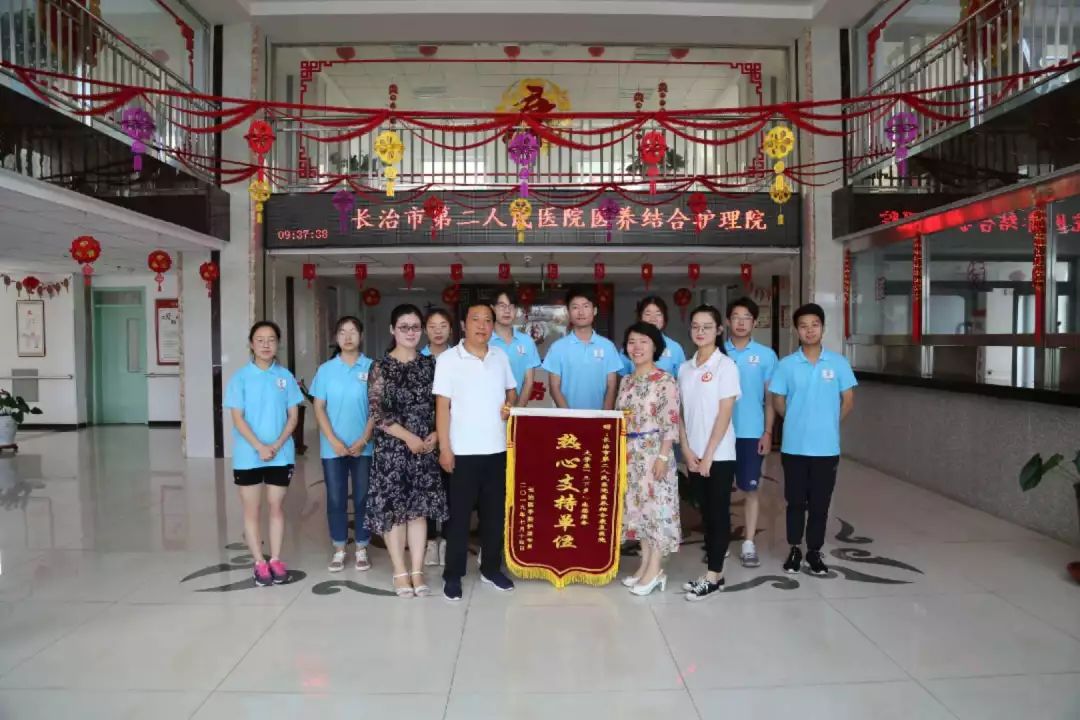 随后,医院王主任肯定和感谢了志愿服务队队员,他指出,暑期社会实践活动为学校和医院搭建了一个非常好的平台,不仅使同学们得到了锻炼,使大学生们在实践的大课堂中了解社会,提高了为人民服务的责任意识,从而还进一步明确了当代青年学生所肩负的历史使命。此次,志愿者们为老人们把党的政策和志愿者们的关怀带到了医院,传播文明新风和民主法制,实现了从理论到实践,很好的达到了从学校到区域的融合效果。接着护理学系办公室主任王晋平老师和护理学系赵文婷副教授向长治市第二人民医院医养结合康复护理院授予“热心支持单位”锦旗。
