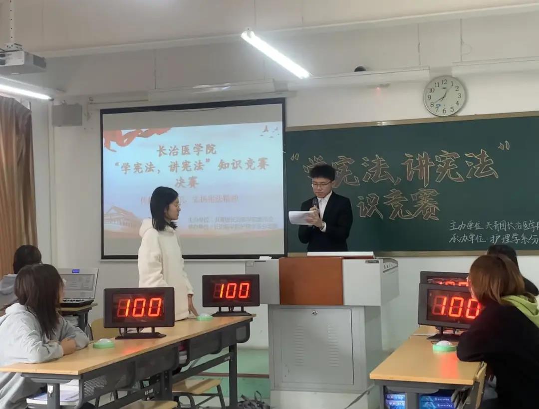 为深入贯彻落实习近平总书记关于宪法学习宣传教育的系列重要指示精神,进一步弘扬宪法精神,推行依法治校理念,增强同学们的法制观念,丰富我校学生的宪法知识,学校举办了“学宪法,讲宪法”主题知识竞赛。知识竞赛由校团委主办、护理学系承办。9月27日,在北区66教举办了知识竞赛决赛。思政部教师范林杰、护理学系分团委书记谢冰、校团委组织部副部长鱼洋担任大赛评委。