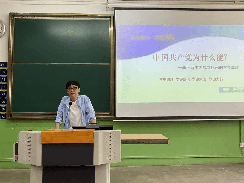牛翠萍教授主要从党史的基本概述、新中国成立以来的主要成就以及中国共产党为什么“能”三方面逐层递进来讲解。从“什么是党史”“党史的基本脉络”“为什么学习党史”三个方面,带大家回顾了中国共产党在发展过程中既波澜壮阔又复杂曲折的奋斗历程。接着,从经济、国防、外交、文化、国防五个方面讲述了新中国成立以来取得的重大成就。并从中国共产党是有远大理想追求的党、是由科学理论引领着的党、是注重实事求是的党、是有自我革命精神的党、是有强大组织能力的党、是有严明纪律规矩的党等各个方面诠释了“中国共产党为什么能”这个问题。