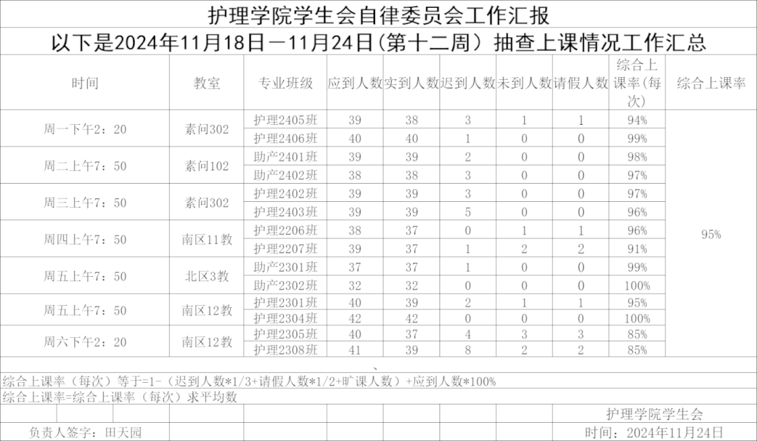现公示第十二周(11月18日-11月24日)英国365公司学生会自律委员会查课迟到情况。