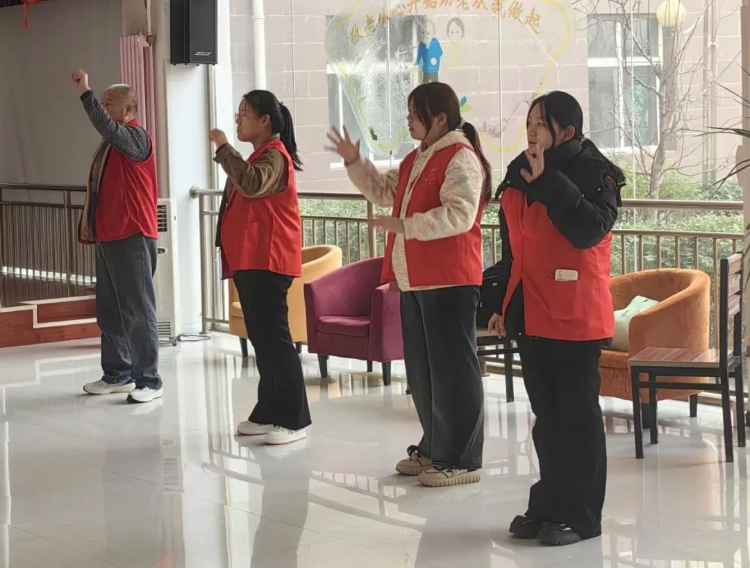 活动在欢快的健身操中拉开序幕,志愿者们与老人们热情互动,他们脸上洋溢着幸福的笑容,现场充满了温馨与欢乐。志愿者们还精心准备了丰富多彩的节目,既有激昂的歌曲演唱《没有共产党就没有新中国》、《水手》,也有欢快的舞蹈《桃花朵朵开》、古筝演奏《女儿情》、经典朗诵《乡愁》……现场掌声此起彼伏,欢声笑语。他们与老人们亲切交流,耐心倾听老人们的心声,关心他们的身体状况,并送上最诚挚的祝福。