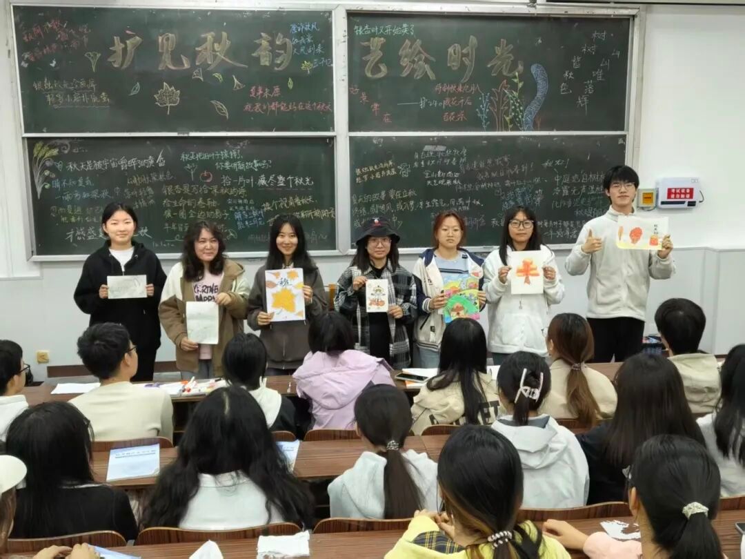 活动伊始,班长向全体同学说明活动主题。过程中,同学们拿起画纸,全身心投入创作,用色彩传递秋意。创作完成后,同学们在黑板上写下对“秋”的印象,从不同视角诠释对秋天的理解。