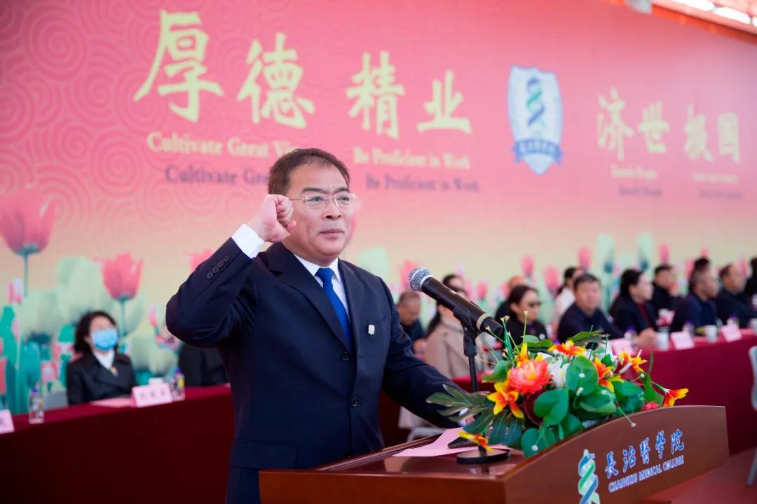 校长王金胜对来自全国各地的新同学表示热烈欢迎,以《与更好的自己携手出发》为题发表了热情洋溢的讲话。他指出,2021年是充满荣光、写满梦想的一年。中国共产党历经风雨洗礼,迎来了建党100周年华诞,开启了砥砺初心向复兴的百年新征程。同学们告别中学生涯、步入大学殿堂,注定了要将学子的荣耀和伟大祖国的前途命运紧密相连,注定了要在实现中华民族伟大复兴的勇敢实践中放飞青春梦想,注定了要在新时代书写属于自己的精彩篇章。他和大家一起品读长医,深情回顾学校创建、发展、壮大的历程,回顾老校长何穆先生的高尚品质和家国情怀,深刻解读长医“三大精神”,希望全体新生继承和发扬“长医精神”,让青春在不懈奋斗中绽放绚丽花朵。