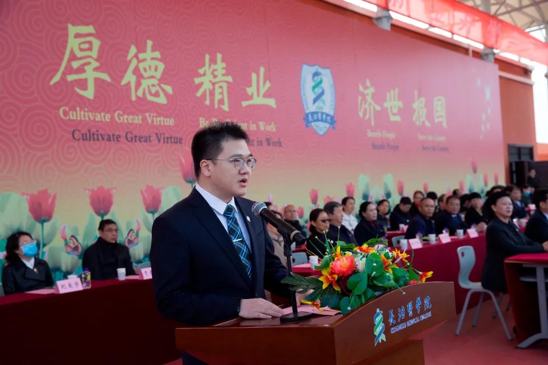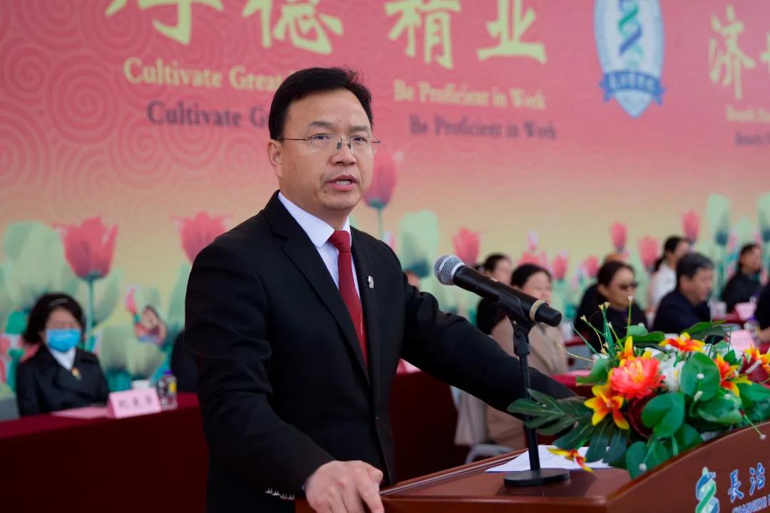 药学系贺艳斌教授代表全体教师对2021级新生表示热烈欢迎。他分享了在长医成长及工作的经历,结合多年从教感悟对同学们提出希望,勉励大家少一点懒散躺平、多一份追求卓越,少一点好高骛远、多一份脚踏实地,少一点个人荣辱、多一份家国担当,从长医启程,乘风破浪,雕琢精彩人生。