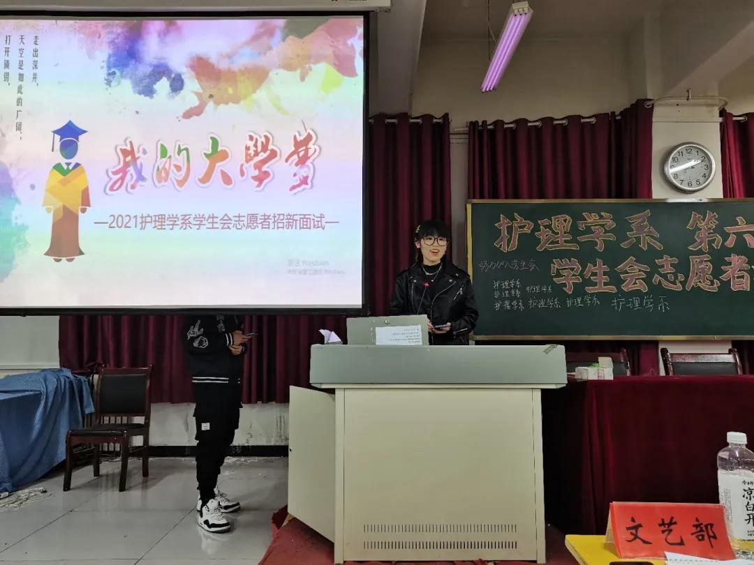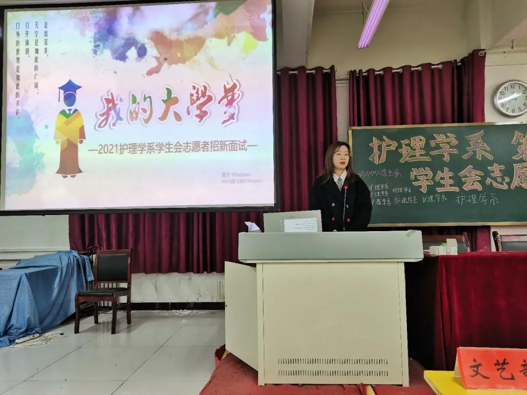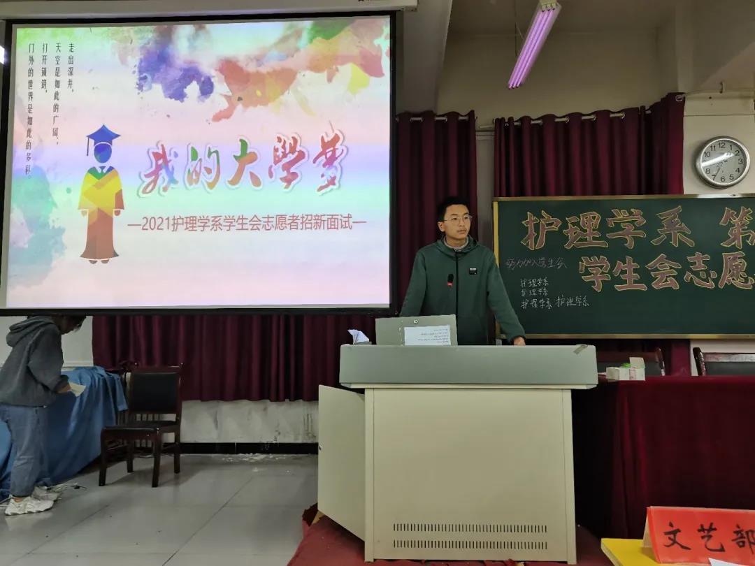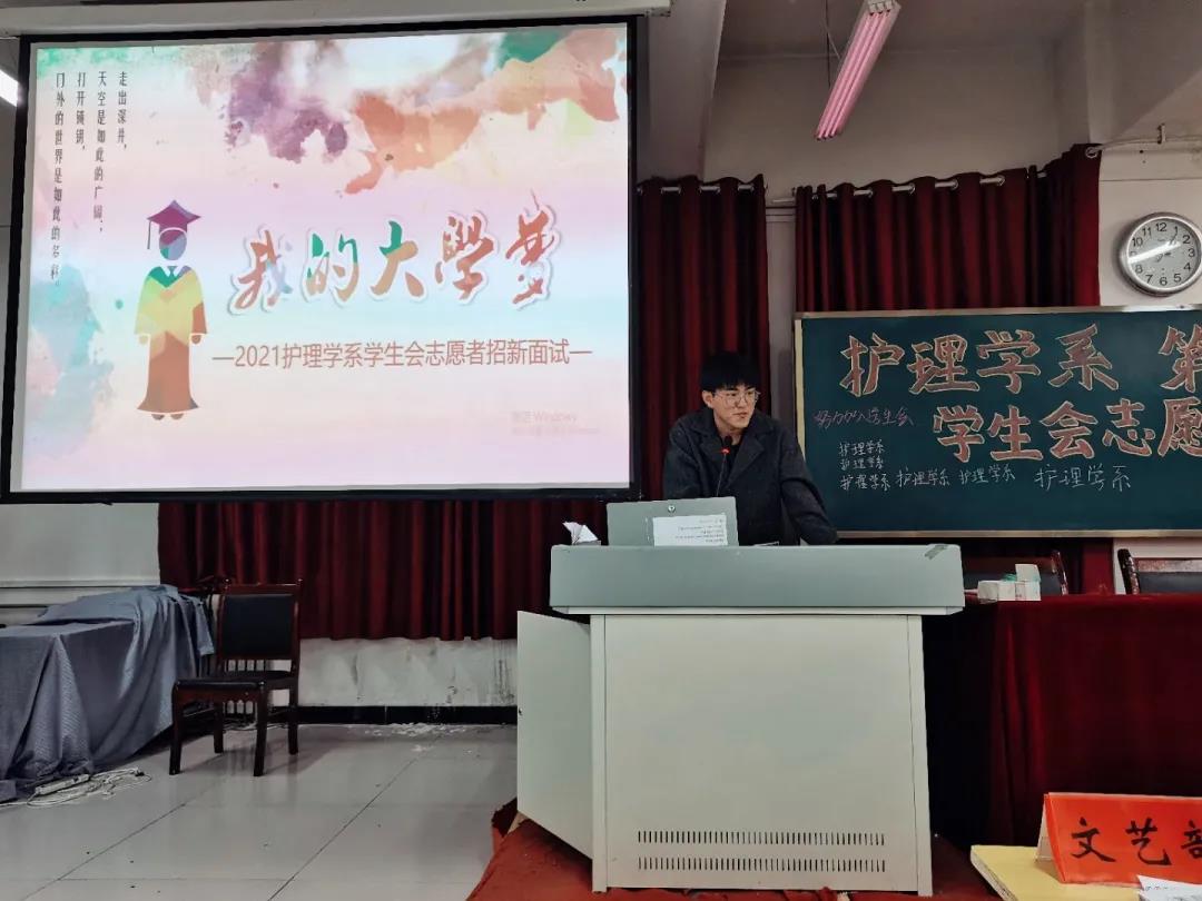 24日的面试由闫俣琪同学主持,面试全程可分为三个部分,第一部分是介绍出席嘉宾和面试流程,出席本次面试的嘉宾有:护理学系学生会主席王静芳、副主席巩昊哲以及各部门负责人,第二部分是各位参加面试的同学依次上台进行自我介绍,面试内容包括自主发言、才艺展示和负责人提问,每一位同学都做好了充分的准备,以极高的热情前来参加面试。