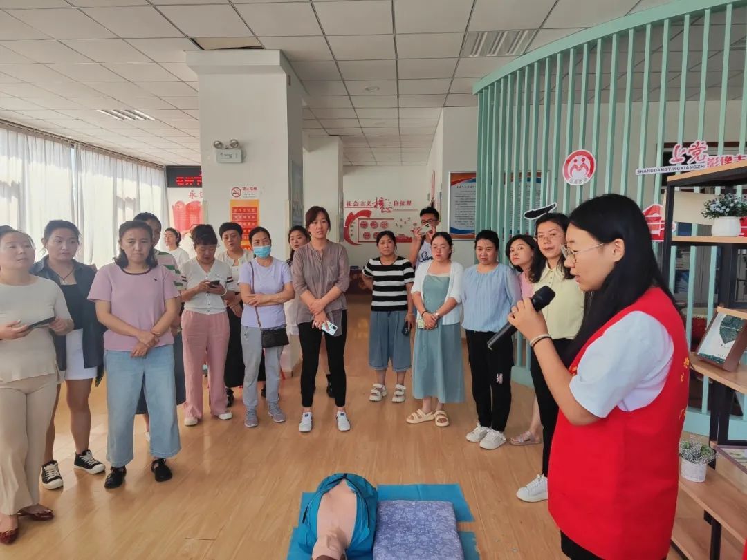 下午3:40,队员们为社区人员进行急救知识的宣讲。经过简单的布置后,马佳楚老师向社区居民们讲解了学习心肺复苏急救知识的目的和重要性。随后,由张佳怡主讲,杨奕配合演示,展示了心肺复苏的操作步骤和注意事项。在讲解过程中,两位同学耐心回答了居民提出的问题。宣讲结束后,社区居民踊跃参与心肺复苏按压练习,队员们一一耐心指导。最后,冯荷梦为社区居民讲解了如何在紧急情况下使用海姆立克急救法进行自救和救助他人。宣讲结束后,大家集体合影留念。