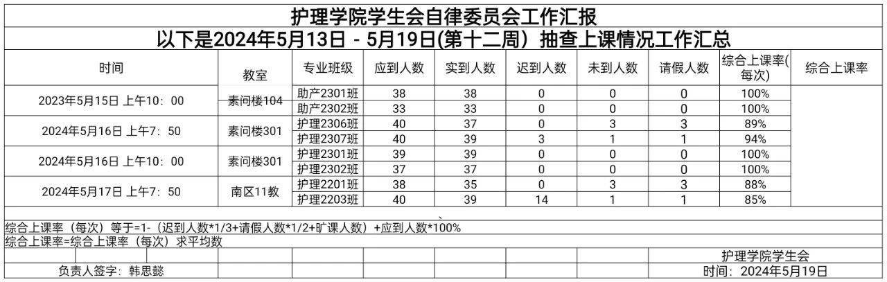 现公示第十二周(5月13日-5月19日)英国365公司学生会自律委员会查课迟到情况。