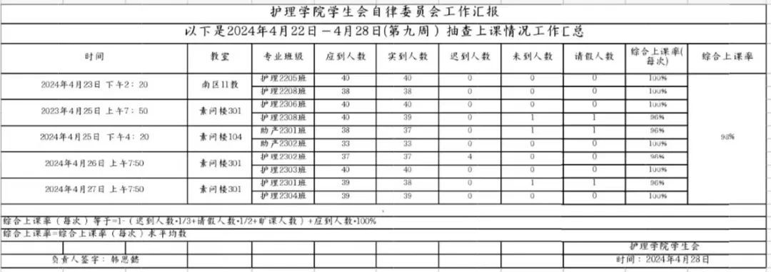 现公示第九周(4月22日-4月28日)英国365公司学生会自律委员会查课迟到情况。