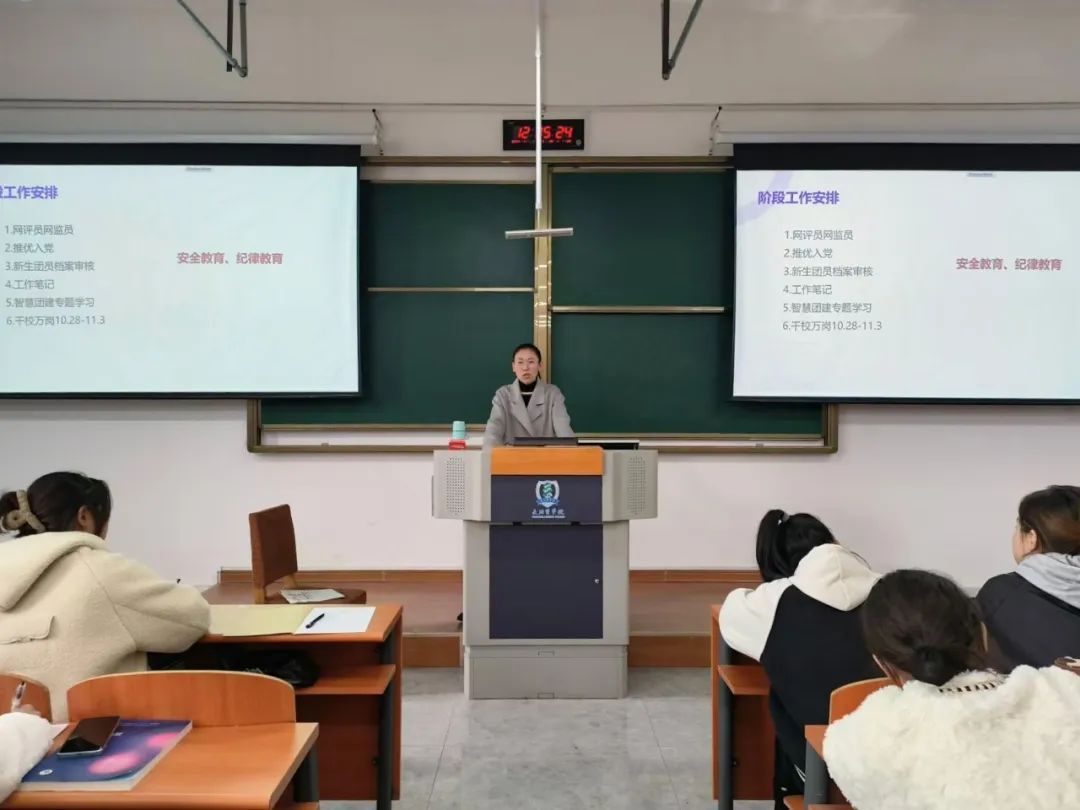 会议开始,王丹老师强调了班团干部在学生工作中应发挥示范引领作用,全面回顾总结了十月份的工作,深刻分析了工作中的不足与差距,对后续的工作进行了规划与部署。此外,王丹老师着重强调了加强安全教育与纪律教育的必要性,要求严格遵守学校各项规章制度,尤其是严格执行好每日查寝制度,严禁电动车搭载人员和私自买卖车牌等违规行为。