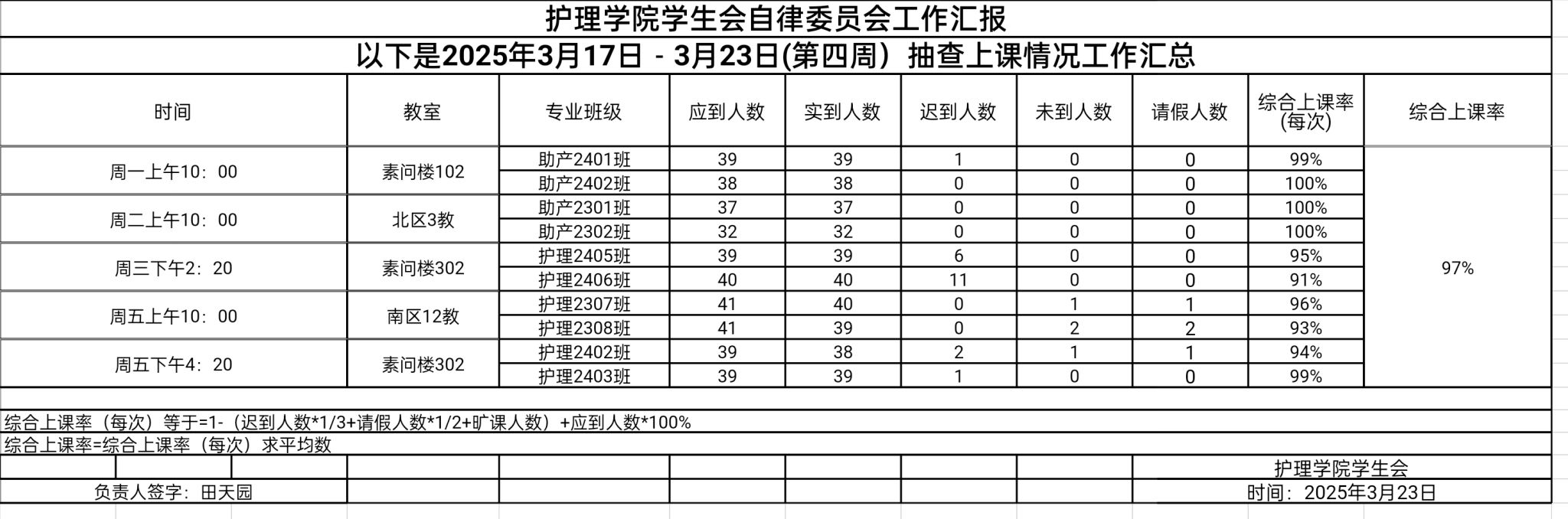 现公示第四周(3月17日-3月23日)英国365公司学生会自律委员会查课迟到情况。