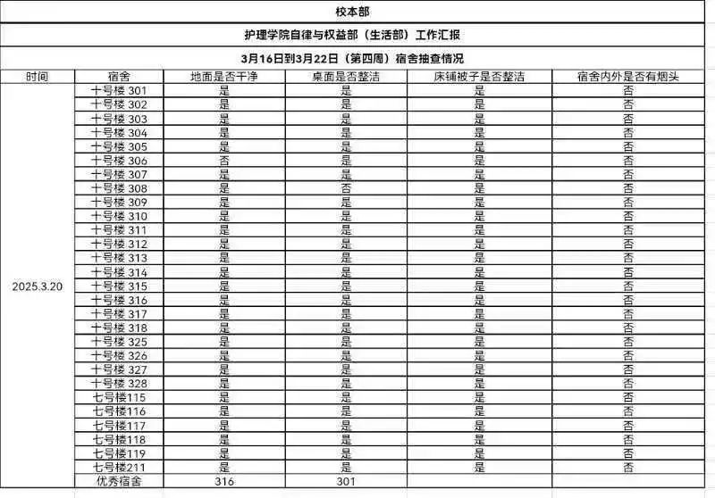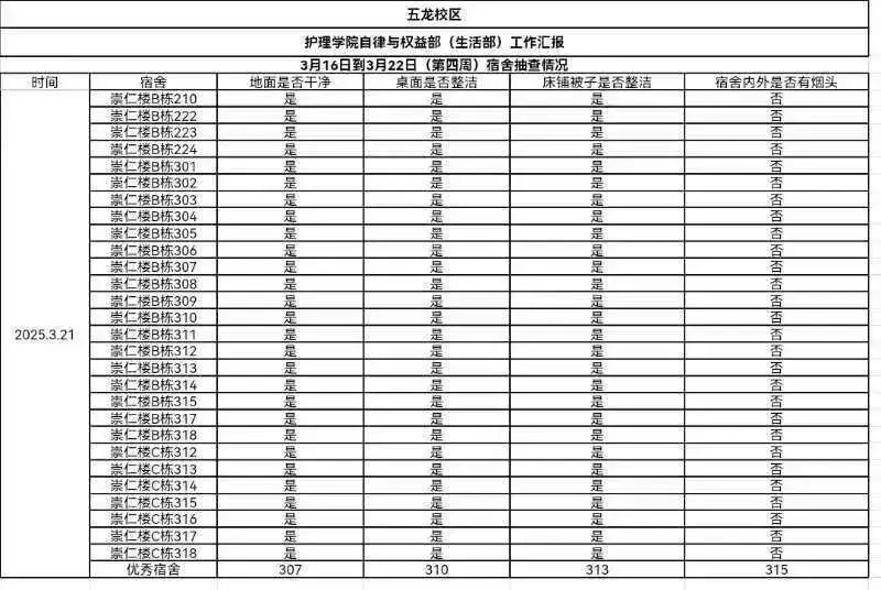 现公示第四周(3月16日-3月22日)英国365公司学生会生活部查寝情况