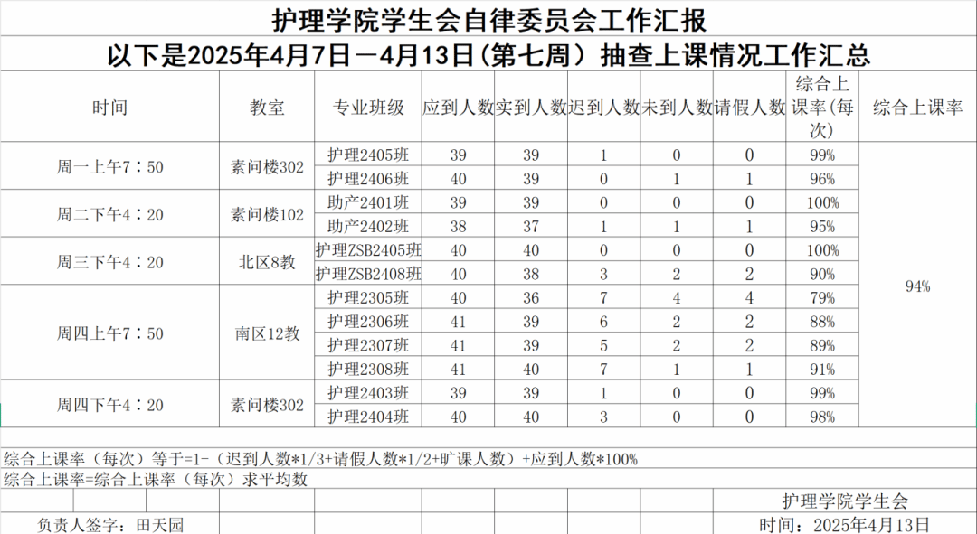 现公示第七周(4月7日-4月13日)英国365公司学生会自律委员会查课迟到情况。