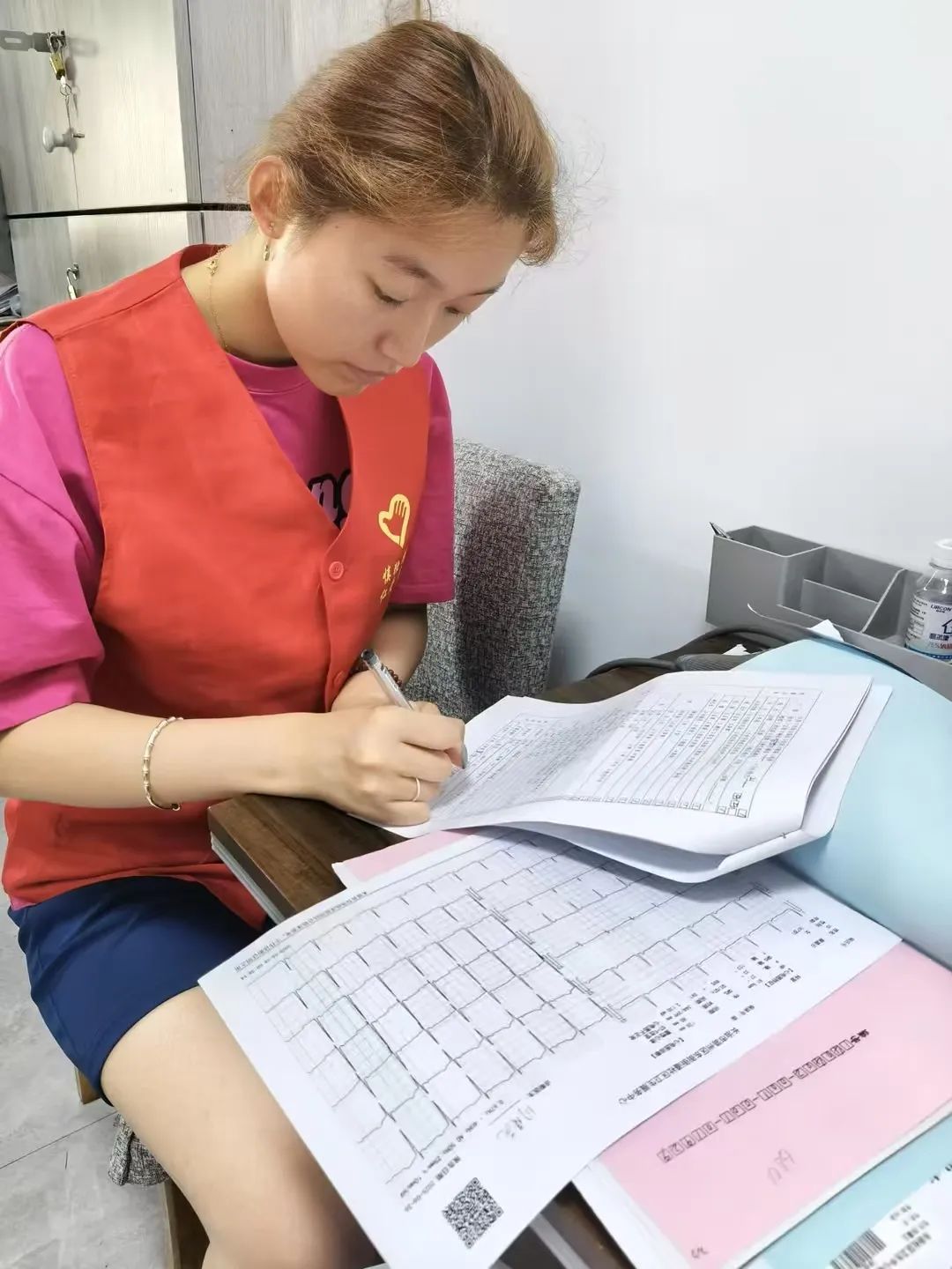 队员们延续高效协作模式,在巩固基础工作的同时融入健康监测服务。上午,我们的队员分为三组,档案管理组负责完善居民健康档案和重点人群专项档案;健康联络组通过电话走访通知体检,并为居民测量血压和体重,结合数据提供基础健康建议;检验协助组精准录入血标本信息,保障检测效率。下午,队员们有序为居民分发解读体检报告,同步筛查未检人员及时提醒,动态更新录入体检结果。